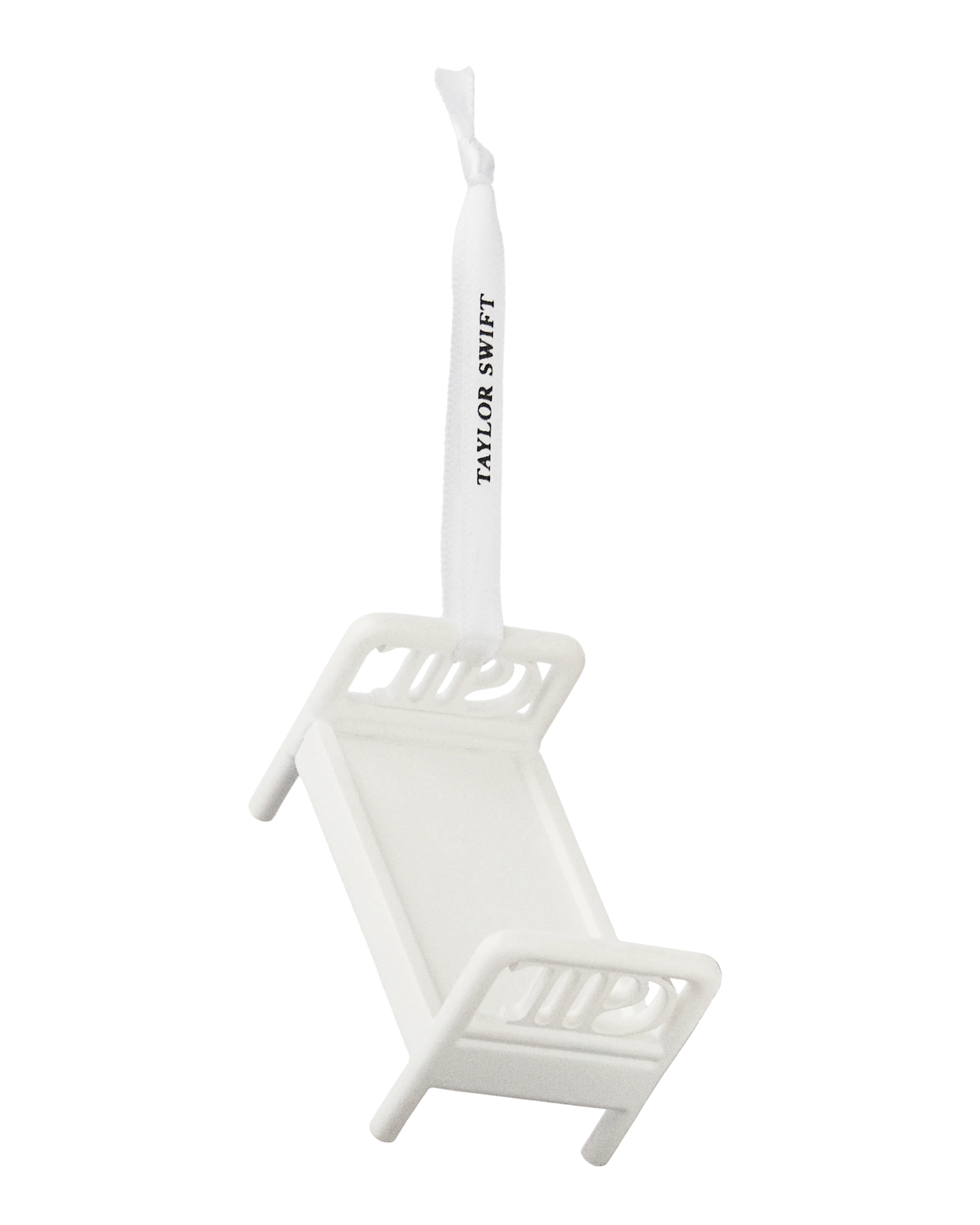 White TTPD bed ornament with "Taylor Swift" logo printed on white ribbon.