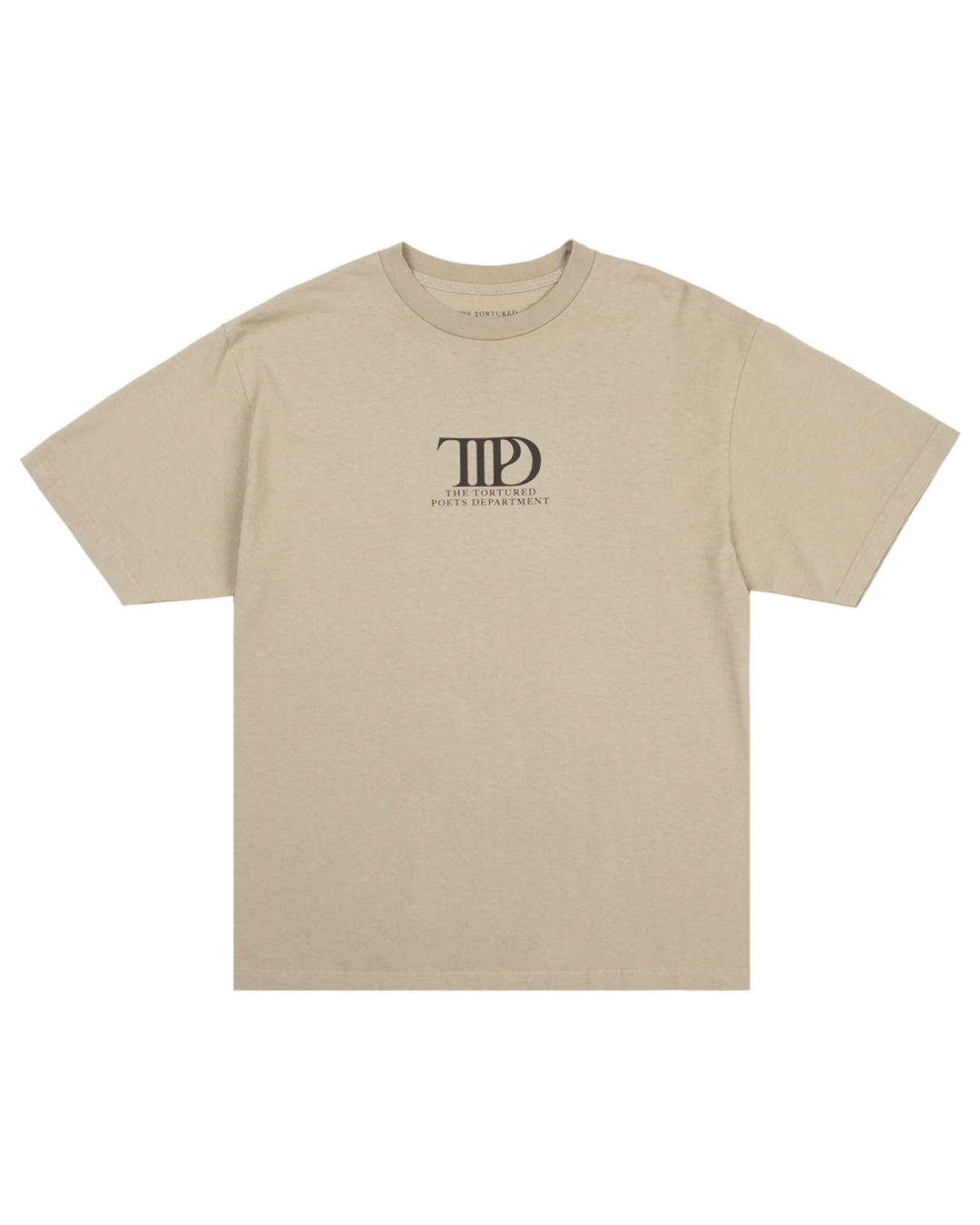 Taupe t-shirt featuring "TTPD" album logo and "The Tortured Poets Department" printed on wearer's chest with cyclone design. "I Chose This Cyclone With You" song lyrics. and "The Tortured Poets Department" printed on back.