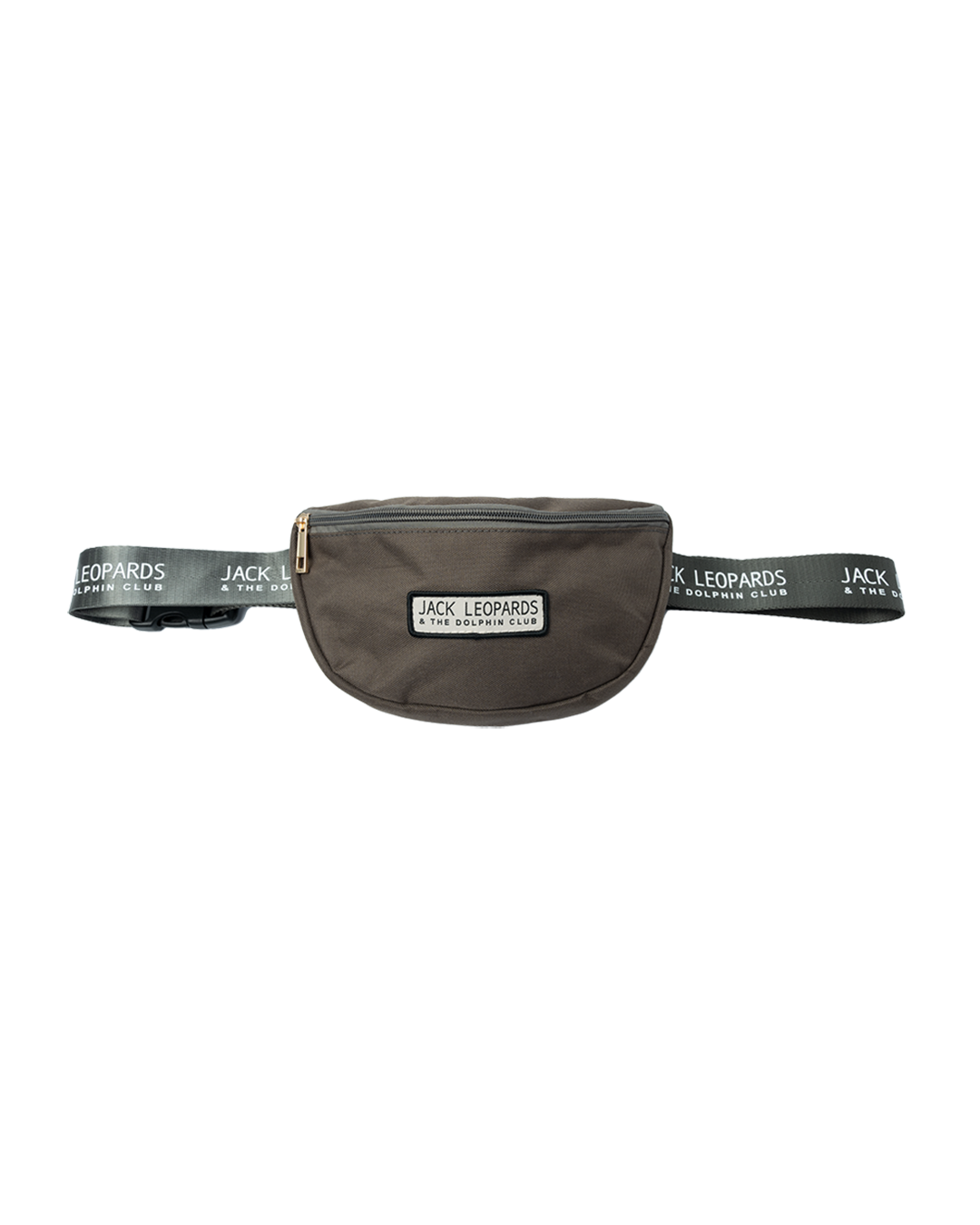 Brown zipper hip bag featuring "Jack Leopards & The Dolphin Club" embroidered on front woven label with "Jack Leopards & The Dolphin Club" repeating logo printed on adjustable strap with buckle closure.