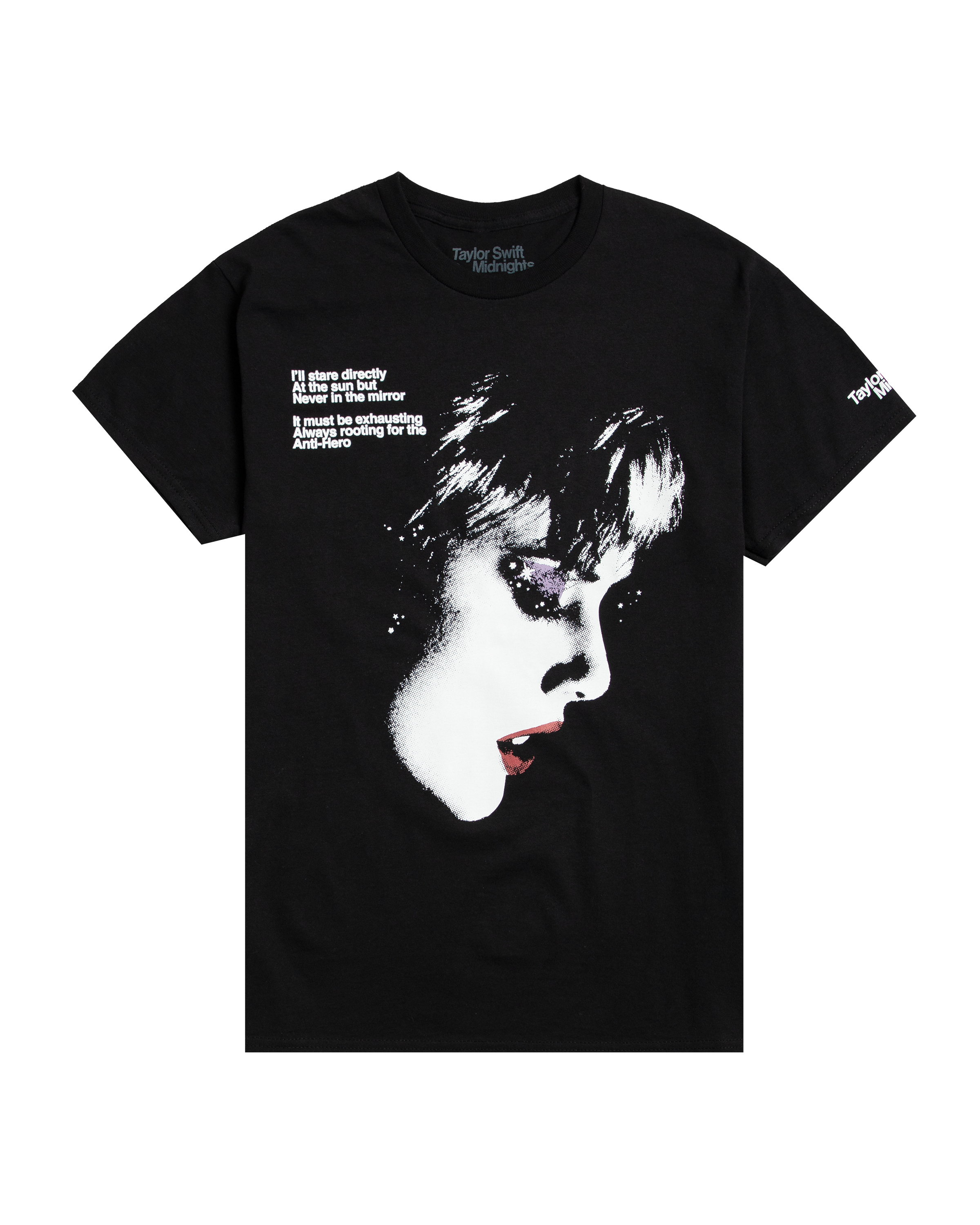 Black t-shirt featuring Taylor Swift Midnights photo and "I'll stare directly At the sun but Never in the mirror It must have been exhausting Always rooting for the Anti-hero" song lyrics and twinkle design printed on front and "Taylor Swift Midnights" printed on wearer's left sleeve.