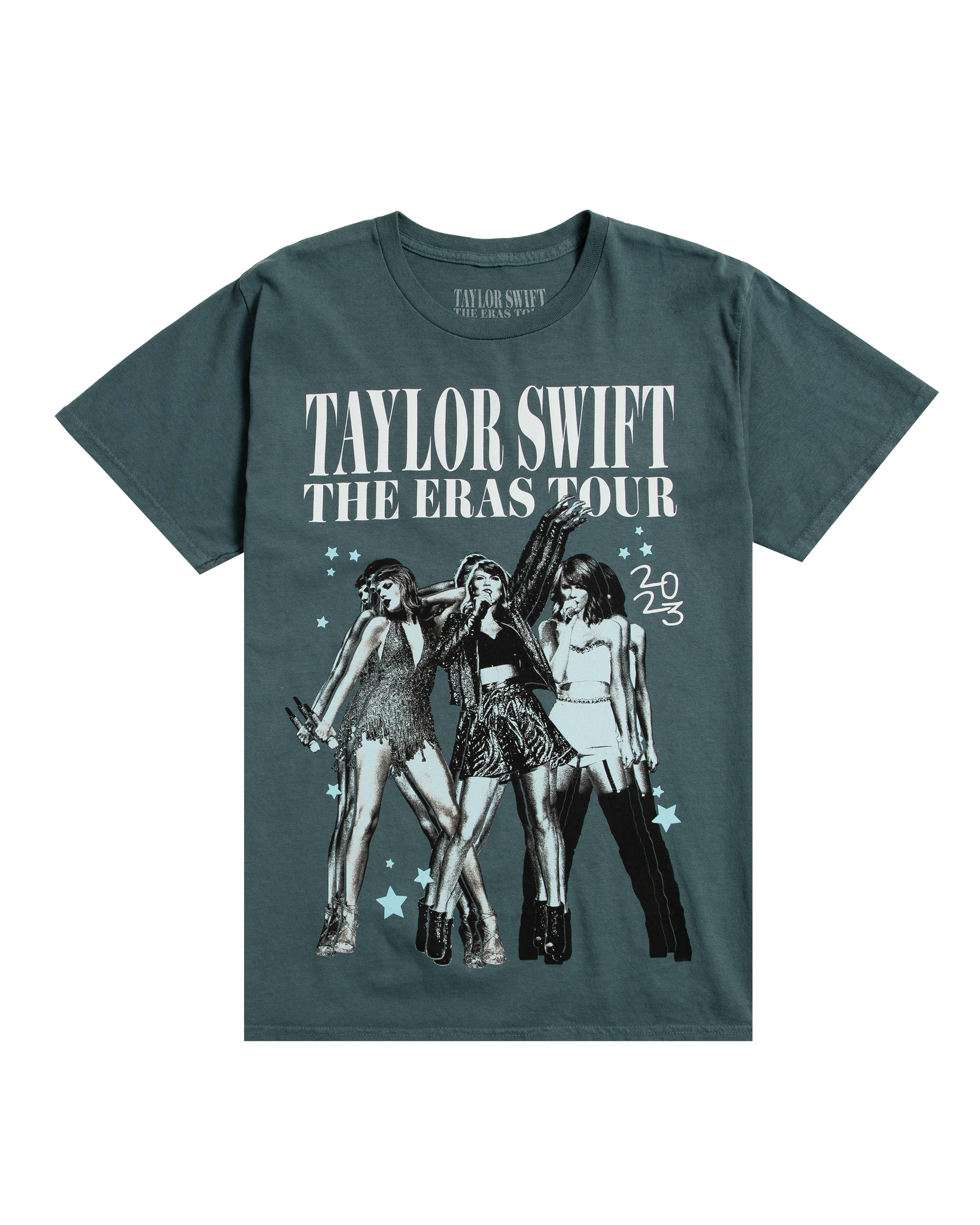 Blue t-shirt with 1989 album era photos of Taylor Swift and "Taylor Swift | The Eras Tour" printed on front with "Taylor Swift | The Eras Tour". tour locations. "2023". and 1989 album era photos of Taylor Swift printed on back.
