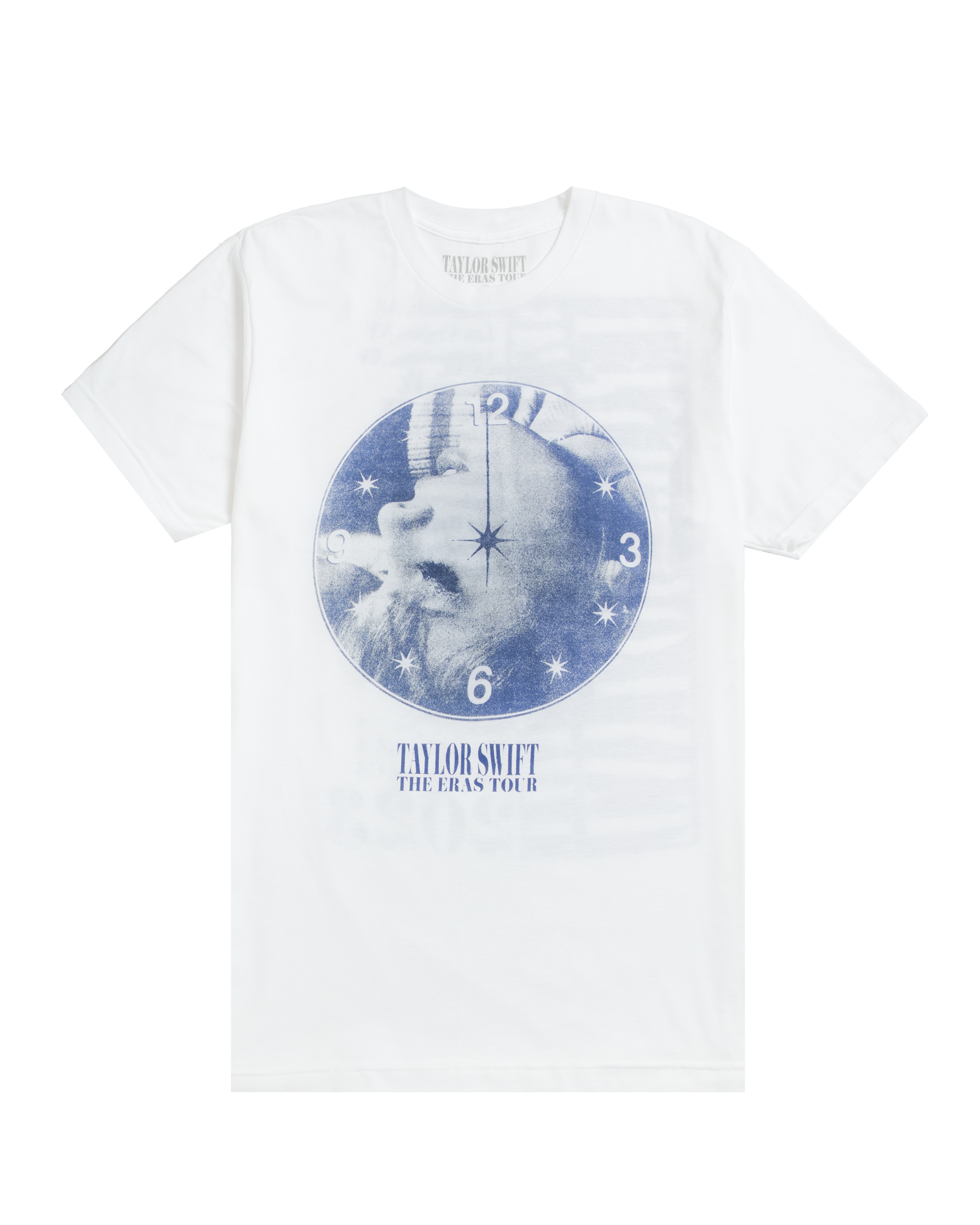White t-shirt with Midnights album era photo of Taylor Swift and "Taylor Swift | The Eras Tour" printed on front and "Taylor Swift | The Eras Tour". tour locations. and 2023 printed on back.