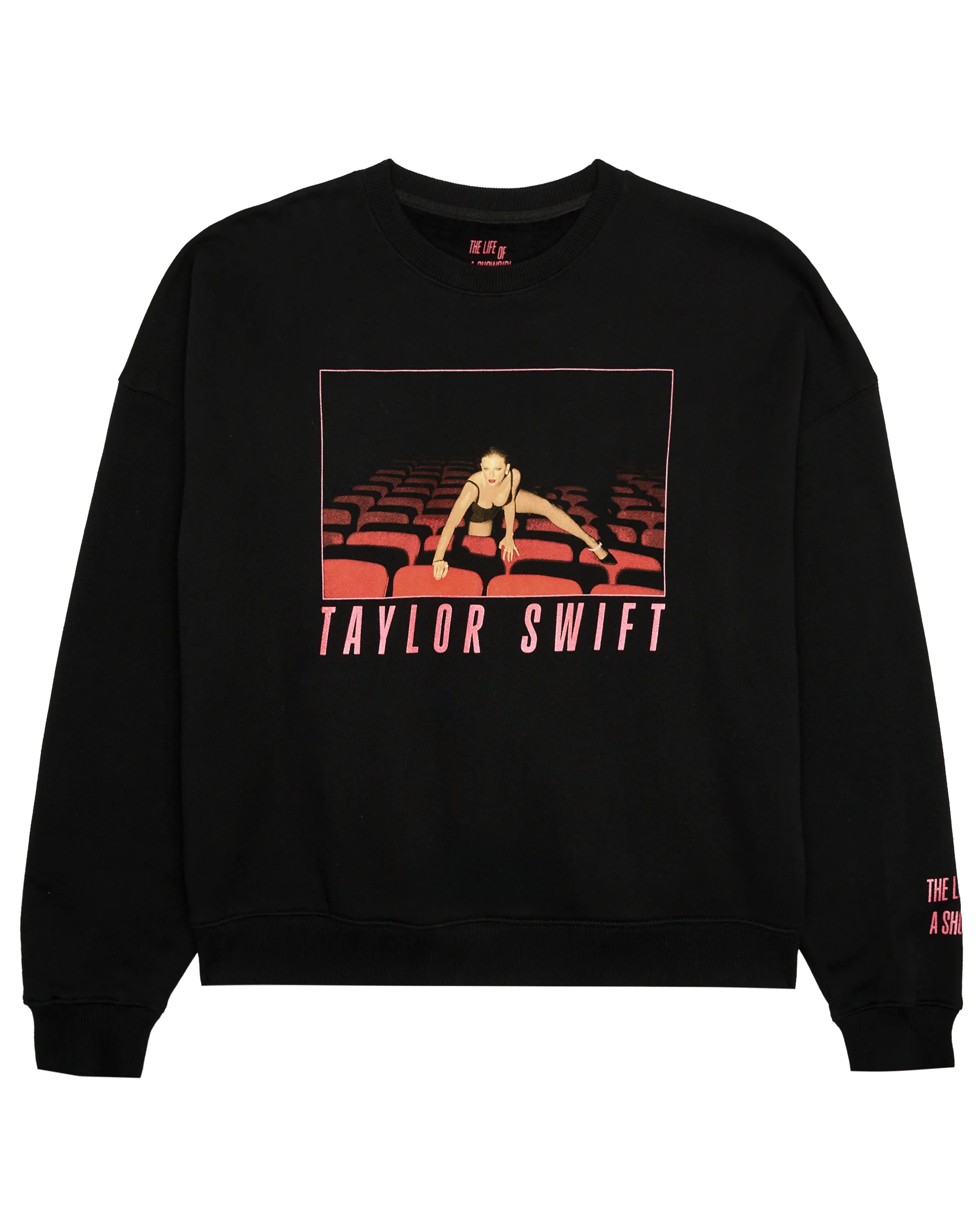 Black long sleeve crewneck sweatshirt featuring "Taylor Swift" logo in red sparkle and photo of Taylor Swift with red sparkle border printed on front with "The Life of a Showgirl" album logo printed in red sparkle on wearer's left sleeve.