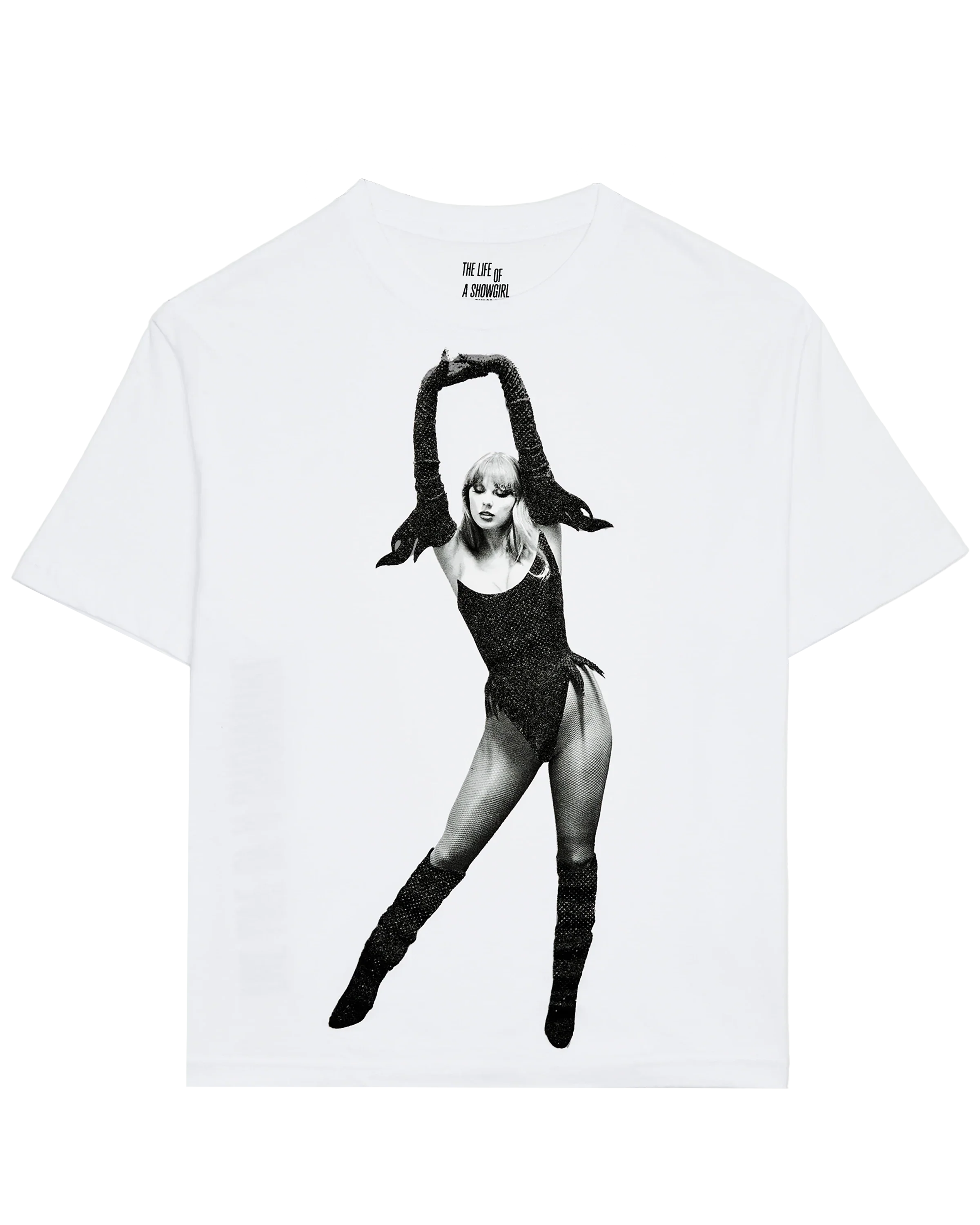 White t-shirt featuring photo of Taylor Swift with black sparkle outfit accents printed on front and "The Life of a Showgirl" album logo printed on back.